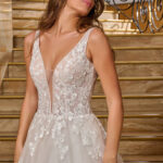 La Belle robe de mariée princesse Amadora est en tulle. Elle n’a pas de ceinture à la taille haute, mais a une traine. Son bustier est en forme de V devant et est aussi tout en dentelle et a des bretelles assez fines. Elle est idéale pour les mariages princesse, dans un château, ou un domaine en pierre.