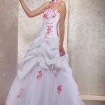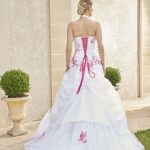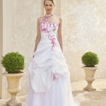 Cette robe de mariée est de forme princesse, elle est en taffetas et en tulle. Le bustier est en forme de coeur et met en avant les baleines et de jolies appliques avec des perles et des sequins. Ensuite la jupe est légèrement bouillonnante sur un tulle lisse sur lequel quelques applications font un rappel. Le collier est fixé à la robe, nous pouvons l’enlever si tel est votre souhait.