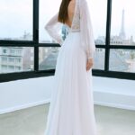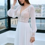 La robe de mariée bohème est en mousseline. Elle a une ceinture à la taille haute, et a une traine. Son bustier est en forme de V devant et est aussi tout en dentelle et a des bretelles larges. Elle est idéale pour les mariages bohème ou champêtre, ou encore vintage.