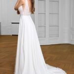 La robe de mariée bohème est en mousseline. Elle a une ceinture à la taille haute, et a une traine. Son bustier est en forme de V devant et est aussi tout en dentelle et a des bretelles larges. Elle est idéale pour les mariages bohème ou champêtre, ou encore vintage.