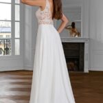 La robe de mariée bohème est en mousseline. Elle a une ceinture à la taille haute, et a une traine. Son bustier est en forme de V devant et est aussi tout en dentelle et a des bretelles larges. Elle est idéale pour les mariages bohème ou champêtre, ou encore vintage.