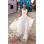 La robe de mariée R129H est de forme bohème. Elle a un décolleté arrondi, pourvu de dentelle et de brillants. Ses bretelles sont en tulle fin. Elle a un petit laçage avec brides au dos. Elle est également pourvu d’une fine ceinture en satin, accompagnée de perles et de sequins.