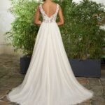 La robe de mariée bohème est en mousseline. Elle a une ceinture à la taille haute, et a une traine. Son bustier est en forme de V devant et est aussi tout en dentelle et a des bretelles larges. Elle est idéale pour les mariages bohème ou champêtre, ou encore vintage.