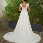 La robe de mariée bohème est en mousseline. Elle a une ceinture à la taille haute, et a une traine. Son bustier est en forme de V devant et est aussi tout en dentelle et a des bretelles larges. Elle est idéale pour les mariages bohème ou champêtre, ou encore vintage.