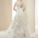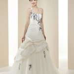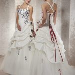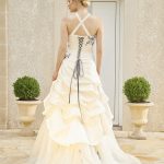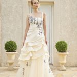La Robe de mariée BORDEAUX est de forme princesse. Le bustier qui est droit laisse apparaître les baleines de couleur (nous pouvons le faire modifier) ainsi que des appliques. Un drapé partant du dessous de la poitrine mettra vos formes en valeur. Le satin bouillonné de la partie jupe se termine sur du tulle orné d’applications. Elle a un laçage au dos de couleur, mais nous pouvons demander le cordon en ivoire ou en blanc. Les bretelles peuvent se porter droites ou à la nuque. Elle a aussi une traine.