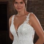 La Robe de mariée Phoebe est de forme princesse. Elle a des bretelles en forme de grand V, avec un décolleté profond.