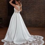 Cette Robe de mariée Phoebe est munie de perles et de sequins sur les appliques en dentelle. Elle a également une très grande traine garnie de dentelle transparente et un dos couvert.