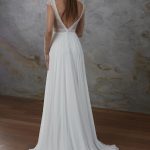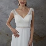 La robe de mariée bohème est en mousseline. Elle a une ceinture à la taille haute, et a une traine. Son bustier est en forme de V devant et est aussi tout en dentelle et a des bretelles larges. Elle est idéale pour les mariages bohème ou champêtre, ou encore vintage.