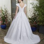 La robe de mariée Triomphe est de forme princesse. Elle a de larges bretelles.