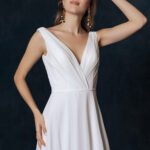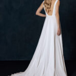 La robe de mariée Venitia est en satin. Elle a une ceinture à la taille haute, et a une traine. Son bustier est en forme de V devant. Elle est parfaite pour les mariées qui veulent du simple.